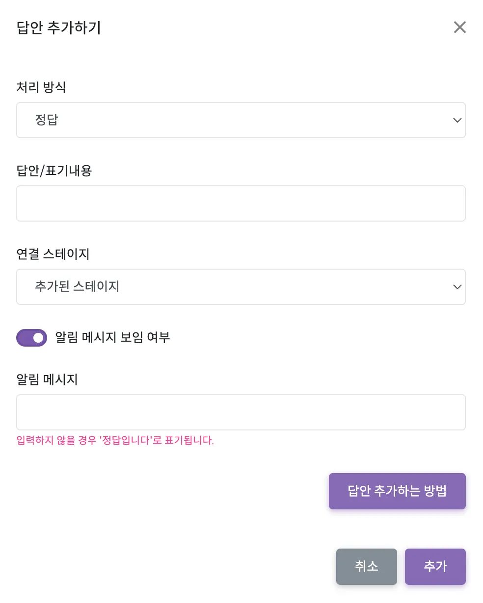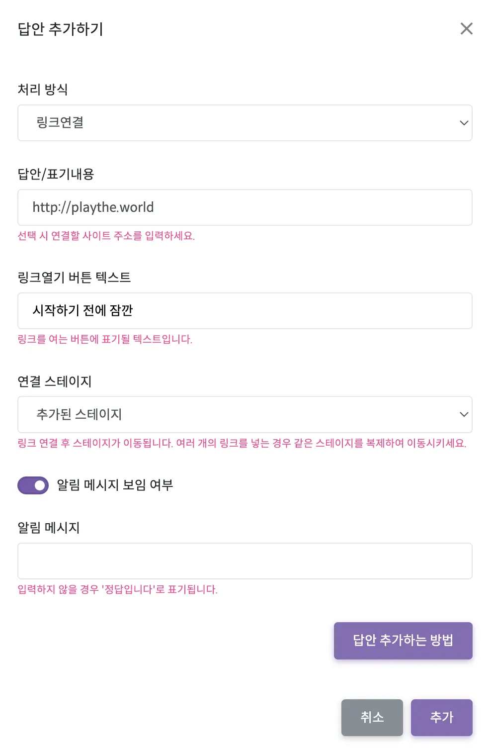 선택지의 처리 방식에는 정답, 오답, 링크 연결이 있습니다. 각각의 처리 방식을 이용해 선택지 미션을 다양하게 활용할 수 있습니다.